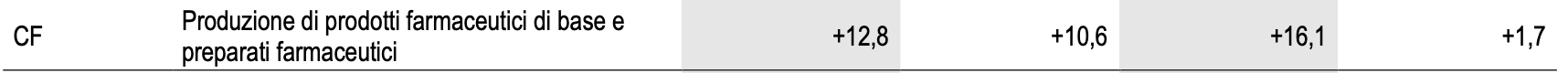The sectors of economic activity that register the incrementi tendenziali maggiori sono la produzione di prodotti farmaceutici di base e preparati farmaceutici (+16,1%), la fabbricazione di mezzi di trasporto (+9,9%) e la fabbricazione di coke e prodotti petroliferi raffinati (+7,1%). La flessione più rilevante si riscontra, invece, nella fornitura di energia elettrica, gas, vapore ed aria (-13,5%).