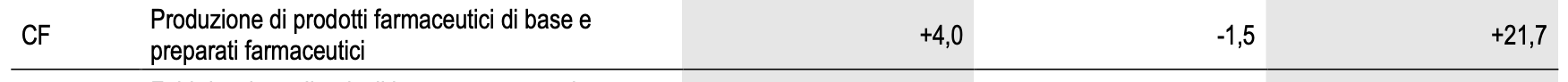 I settori di attività economica che presentano gli incrementi tendenziali maggiori sono la produzione di prodotti farmaceutici di base e preparati farmaceutici (+21,7%), l’industria del legno, della carta e stampa (+6,2%) e la fabbricazione di prodotti chimici (+4,3%). Le flessioni più ampie si rilevano nella fabbricazione di mezzi di trasporto (-13,1%), nelle industrie tessili, abbigliamento, pelli e accessori (-12,3%) e nella fabbricazione di coke e prodotti petroliferi raffinati (-6,2%).