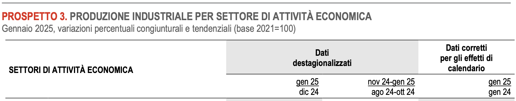 Al netto degli effetti di calendario, a gennaio 2025 l’indice generale diminuisce in termini tendenziali dello 0,6% (i giorni lavorativi di calendario sono stati 21 contro i 22 di gennaio 2024). Si registra una crescita esclusivamente per i beni di consumo (+0,4%); al contrario, diminuzioni contraddistinguono i beni strumentali e l’energia (-0,8% per entrambi i raggruppamenti di industrie) e i beni intermedi (-0,6%).