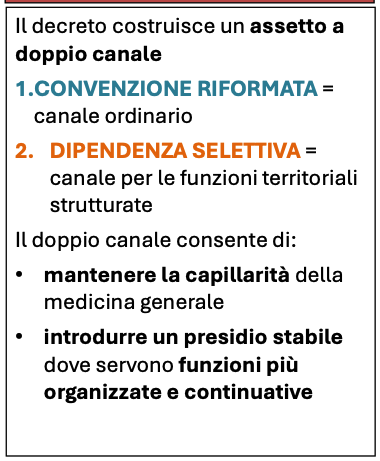 Meno netta la posizione dello Snami. Non boccia il principio del doppio canale, ma invita a un approccio più prudente: la dipendenza, nelle condizioni attuali, “non è realisticamente percorribile”. Il rischio, spiegano i rappresentanti della sigla, è duplice: da un lato molti giovani non dispongono di un percorso formativo già compatibile con un modello da dipendenti; dall’altro i medici convenzionati, spesso con studi avviati da anni, dovrebbero smantellare la propria organizzazione professionale, with a impatto diretto sull’assistenza nei territori. Lo Snami chiede quindi una riforma più graduale, che rafforzi la rete esistente senza “destrutturare” il sistema attuale. “Tutto questo non può e non deve passare tramite decreti legislativi ma solo attraverso la concertazione con i sindacati di settore.”