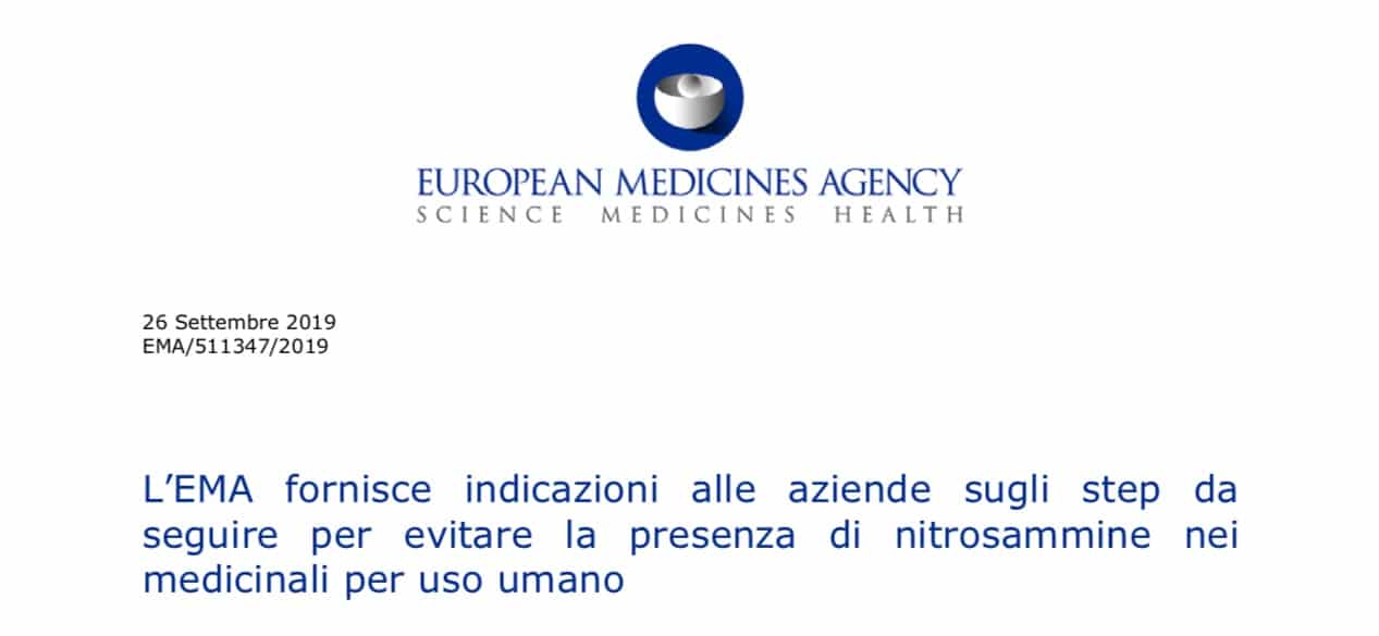 Il Comitato per i Medicinali per Uso Umano dell’EMA (CHMP) sta richiedendo a titolo di precauzione che i titolari di autorizzazioni all’immissione in commercio (AIC) dei medicinali per uso umano a base di principi attivi prodotti per sintesi chimica revisionino i propri medicinali per la possibile presenza di nitrosammine e