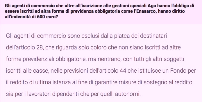 Per gli agenti di commercio iscritti alle gestioni speciali INPS ma anche all’Enasarco, di conseguenza esclusi dall’indennità prevista dall’articolo 28 del Cura Italia (che riguarda autonomi iscritti alle gestioni speciali Ago, non titolari di pensione e non iscritti ad altre forme previdenziali obbligatorie), specifica il MEF in una apposita FAQ che «rientrano, con tutti gli altri soggetti iscritti alle casse, nelle previsioni dell’articolo 44 che istituisce un Fondo per il reddito di ultima istanza al fine di garantire misure di sostegno al reddito sia per i lavoratori dipendenti che per quelli autonomi». (estratto dal sito PMI.it)