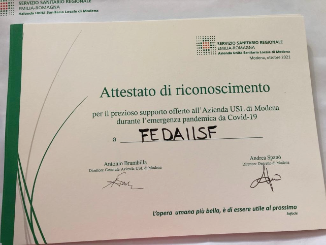 Come ISF Volontari siamo orgogliosi di avere ricevuto l’ attestato e di essere riusciti a mettere a disposizione le nostre competenze per il bene pubblico. Ringraziamo il dott. Spanò per avere creduto in noi fin dall’inizio cosicché siamo riusciti a dare una mano alla Sanità Modenese da marzo 2020 inizio della pandemia