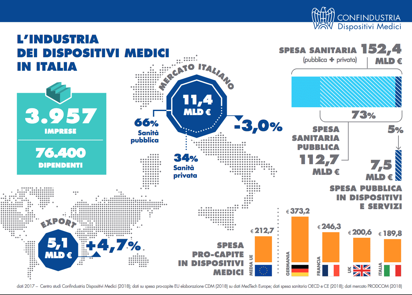 Nasce in Confindustria una nuova Federazione: la Confindustria dispositivi medici. L’obiettivo è riunire l’intero mondo delle imprese di dispositivi medici e dare voce a un mercato in espansione, composto anche dalle nuovissime categorie di prodotti che stanno entrando in questi ultimi anni nella medicina e nella vita delle persone. Si tratta di 1 milione e mezzo di dispositivi medici che vanno dalle attrezzature chirurgiche alle grandi apparecchiature diagnostiche, dai test di laboratorio a quelli genetici per predire alcune patologie, dai software per il monitoraggio dei parametri vitali grazie alla telemedicina alle App mediche, dalle protesi dentali agli ausili sanitari.