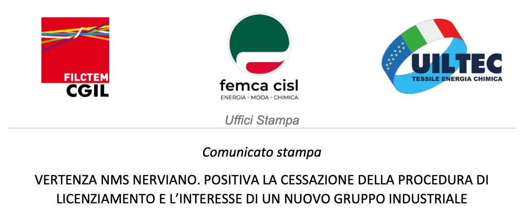 “Accogliamo positivamente la notizia della cessazione della procedura di licenziamento collettivo per le lavoratrici e i lavoratori della Nerviano Medical Sciences. Nei prossimi giorni sarà formalizzata in Lombardy region e si determineranno le modalità di erogazione della Cassa Integrazione strumento con il quali si intende riaccompagnare il processo di reindustrializzazione”: hanno affermato le segreterie nazionali di Filctem Cgil, Femca Cisl, Uiltec Uilal termine dell’incontro al Ministero dell’Impresa e del Made In Italy questa mattina per la Vertenza NMS.