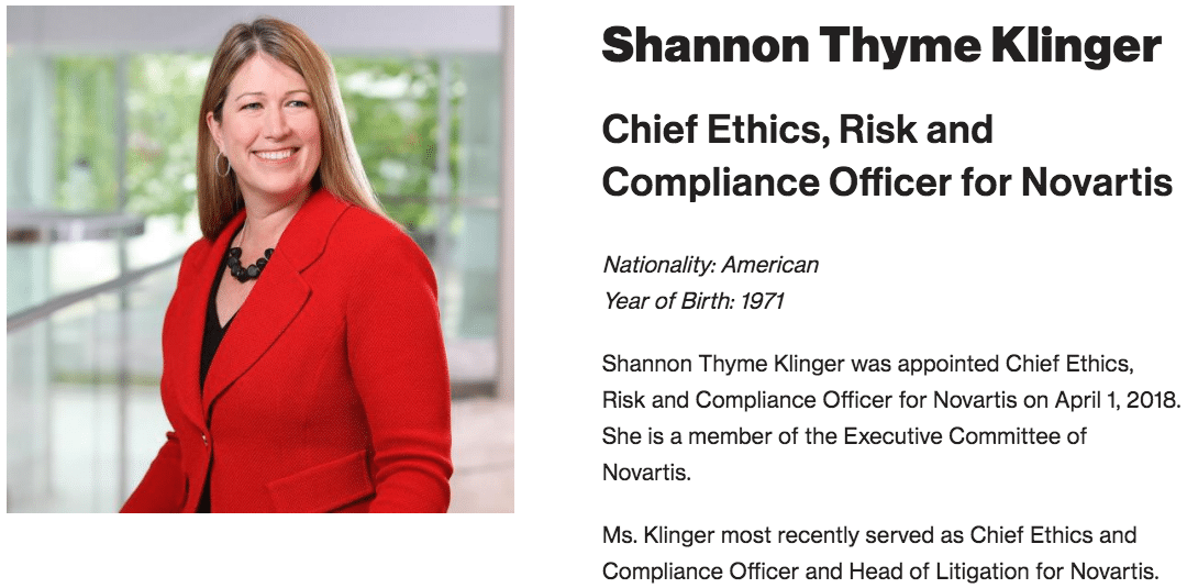 “We want to reinforce the message and the quality at the top,” said Klinger, interviewed by telephone. “We have made it clear to the organization, as well as publicly, that we never want Novartis to meet financial performance objectives because we have compromised our ethical standards or values. We must always choose our values. “