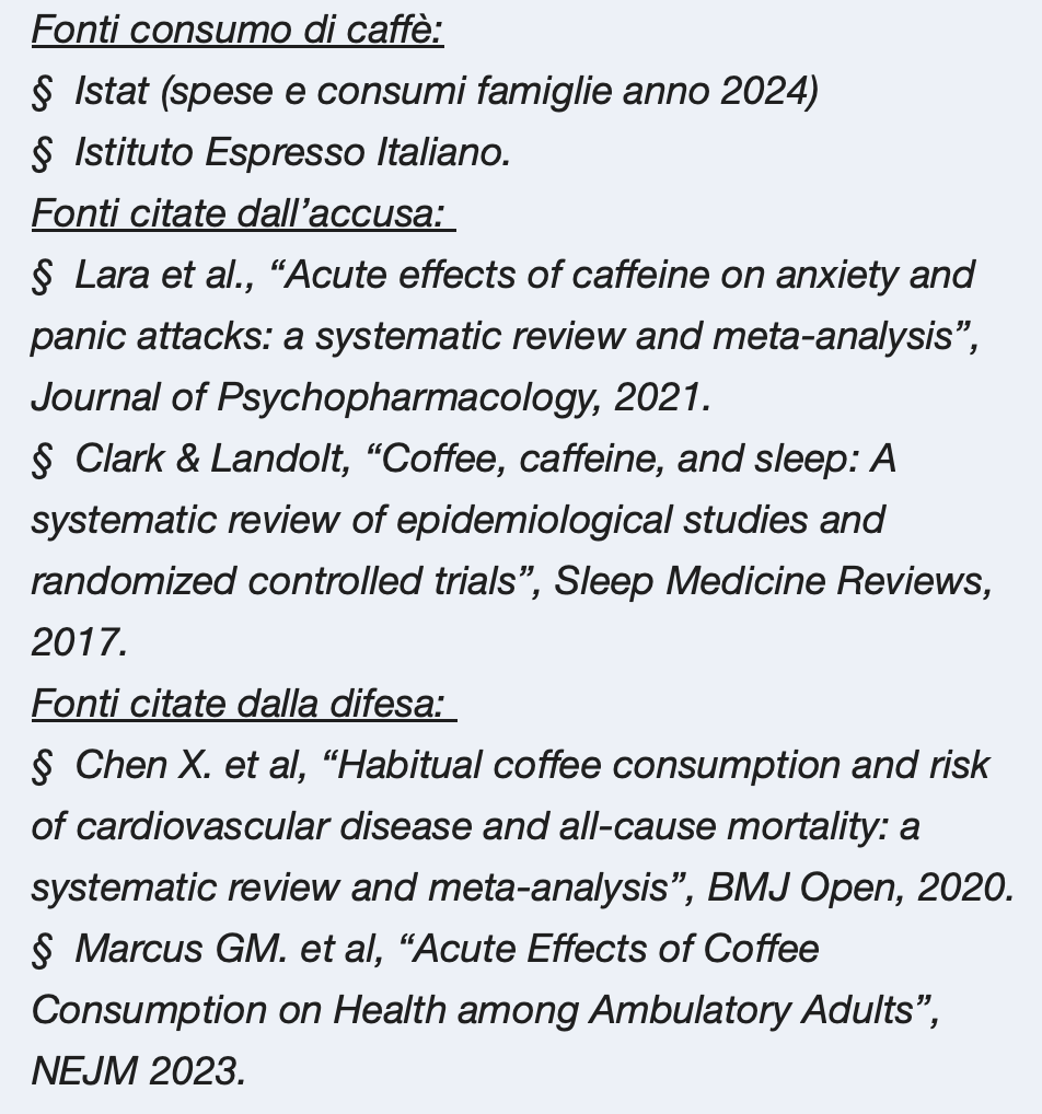 In particolare, il giudice ha sottolineato la necessità di distinguere tra caffeina e caffè, richiamando il principio secondo cui va evitato un consumo eccessivo e individuando, in linea con i parametri minimi delle linee guida, una soglia orientativa di non oltre tre tazzine di caffè italiano al giorno. È stata anche ribadita la differenza tra persone sane e persone con patologie cardiovascolari, neurologiche o con disturbi del sonno.