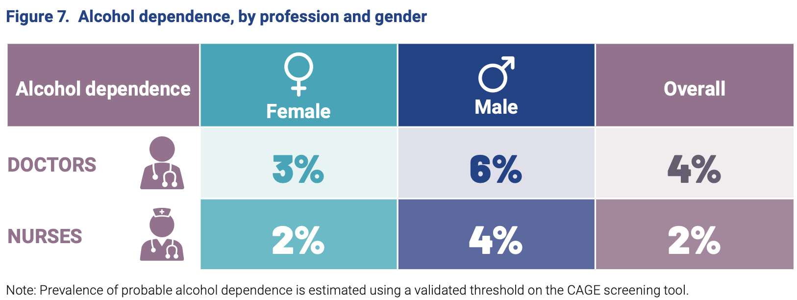 La prevalenza aggregata di probabile dipendenza da alcol è più alta tra i medici che tra gli infermieri, con i medici uomini che segnalano la prevalenza più elevata (Fig. 7).