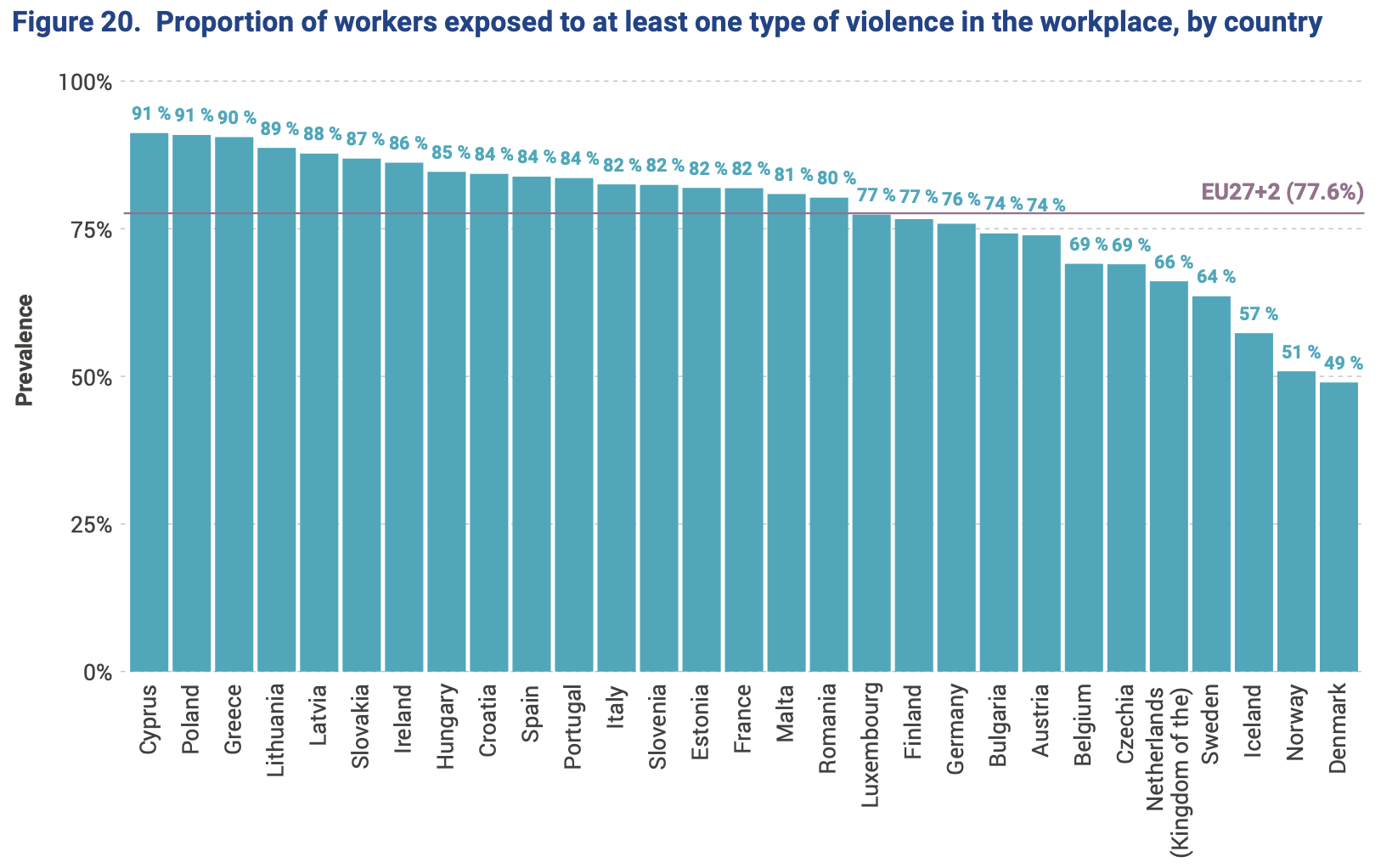 Oltre la metà degli intervistati ha segnalato almeno un tipo di violenza sul posto di lavoro. Sebbene vi siano grandi differenze tra i paesi (ad esempio, il 49% in Danimarca contro il 91% a Cipro e in Polonia), le percentuali sono in generale significative (Fig. 20).