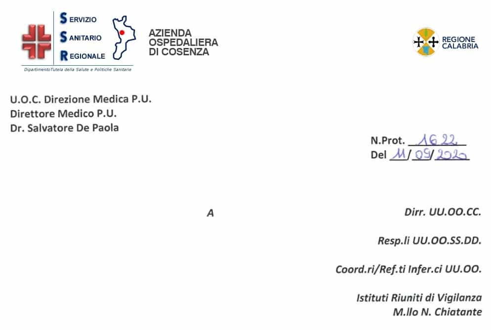 Annunziata Cosenza hospital. New provisions for ISF. Addressed to all, except interested parties! Fedaisf editorial staff September 12, 2020 NOTE N.PROT.1622 OF 09.11.2020 Departments