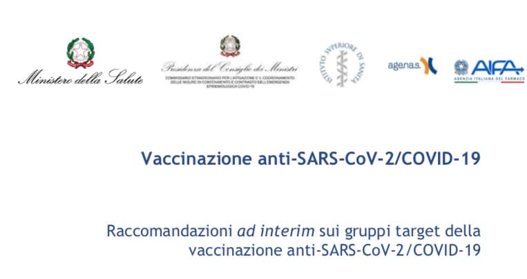 Il ministero della Salute in collaborazione con la struttura del Commissario Straordinario per l’emergenza COVID, AIFA, ISS e AGENAS ha elaborato il documento Raccomandazioni ad interim sui gruppi target della vaccinazione anti-SARS-CoV-2/COVID-19 che aggiorna le categorie a cui offrire la vaccinazione e l’ordine di priorità per l’attuazione della seconda fase del Piano strategico dell’Italia per la vaccinazione anti SARS-CoV-2/COVID-19, adottato con DM del 2 Gennaio 2021, in base all’evoluzione delle conoscenze e alle informazioni sui vaccini disponibili.
