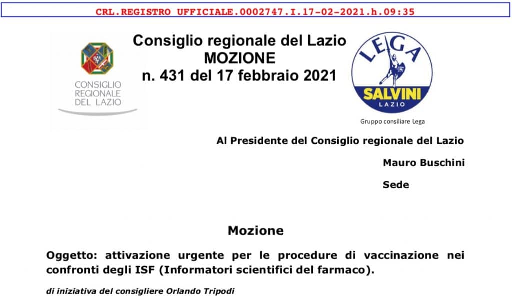 ➢ a disporre con la massima urgenza che tra le categorie prioritarie contenute nell’ambito del Piano Regionale Vaccinazione anti-SARS-CoV2 venga inserita nell’immediato le figura di informatore scientifico del farmaco (ISF).