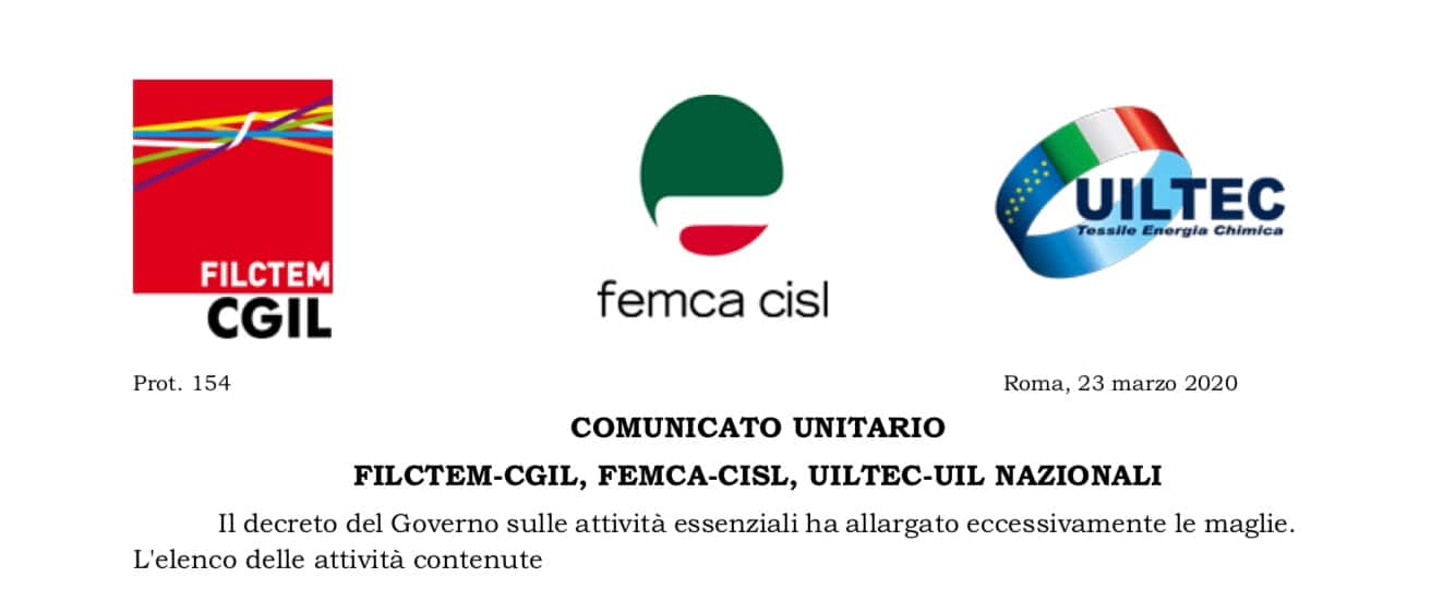Filctem Femca e Uiltec Nazionali condividono il documento unitario delle Confederazioni e garantiranno copertura politica per tutte le iniziative che le strutture e le Rsu, appartenenti ai settori aggiunti nello schema del decreto che non rispondono alla caratteristica di attività essenziali, riterranno opportuno mettere in campo, fino alla proclamazione di sciopero.