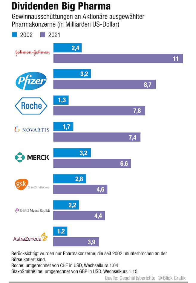 Un’analisi di SonntagsBlick mostra che nel 2002 i giganti del settore Astrazeneca, Bristol-Myers Squibb, GlaxoSmithkline, Johnson & Johnson, Merck, Novartis, Pfizer e Roche hanno distribuito dividendi per un totale di 17,9 miliardi di dollari. Nel 2021, queste società hanno pagato 54,4 miliardi di dollari, il triplo.
