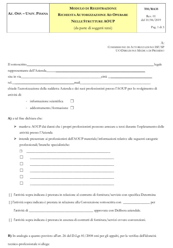 The resolution, after comparison with AIISF/FEDAIISF (also recognized in the text of the provision) replaces a previous provision which would have effectively prevented the activity of scientific representatives in the important Tuscan hospital.