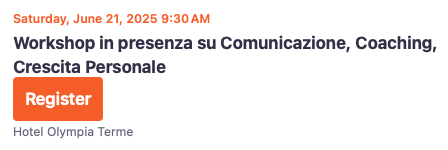 Di seguito, il Programma dettagliato del Workshop Intensivo su Comunicazione, Crescita Personale e Coaching della durata di 2 giornate, che si svolge in modalità esperienziale su una grande varietà di temi e i migliori trainer in Italia sul tema della Crescita Personale e Coaching.
