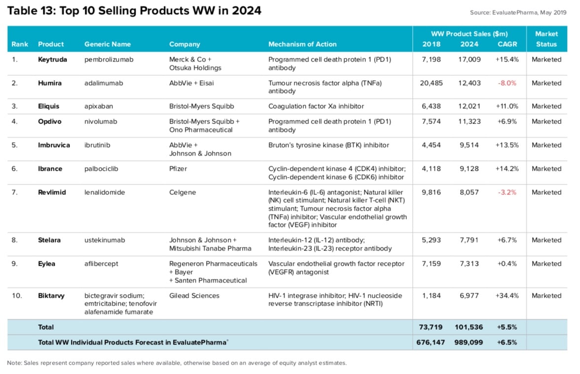 - Nel caso che Bristol Myers-Squibb completasse l’acquisizione prevista di Celgene e la relativa acquisizione di portafoglio, la nuova entità sarebbe la terza più grande azienda farmaceutica sulla base delle vendite dei farmaci da prescrizione previste per il 2024.
