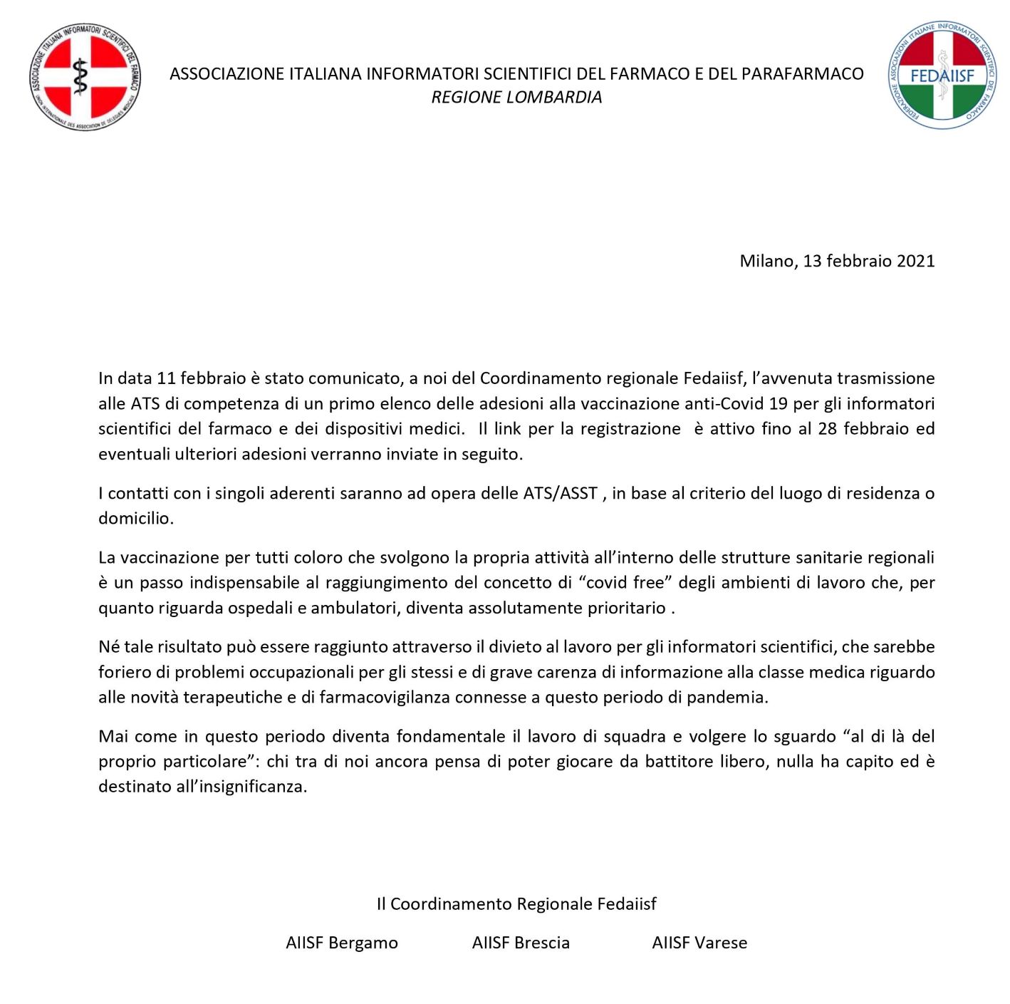 Comunicato: FEDAIISF LOMBARDIA Comunicato 13 febbraio 2021