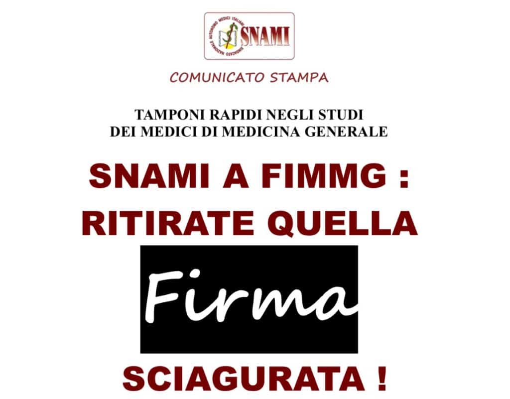 <Inoltre> aggiunge Salvatore Santacroce, tesoriere nazionale Snami, <per i Medici ultrasessantacinquenni, ad alto rischio per definizione, l’inaccettabile, scellerata imposizione di esporsi ad una notevole possibiltà di contagio, potrebbe indurre molti di loro ad andare in pensione prima di quanto preventivato, anche per evitare di danneggiare se stessi e i propri familiari, in un periodo in cui scarseggiano i Medici e si cerca di richiamare quelli già in pensione. <Stanno circolando> conclude Angelo Testa <delle vere e proprie e vere bufale che cercano di diluire la gravità del percorso tamponi, asserendo che saranno le regioni a decidere. Non è così. I Colleghi meritano la verità e cercare di distorcere questa imposizione ragionevolmente irrealizzabile da una buona parte di Noi, sarebbe non una semplice omissione di parte della verità ma una vera distorsione dolosa della intera sostanza della verità. >