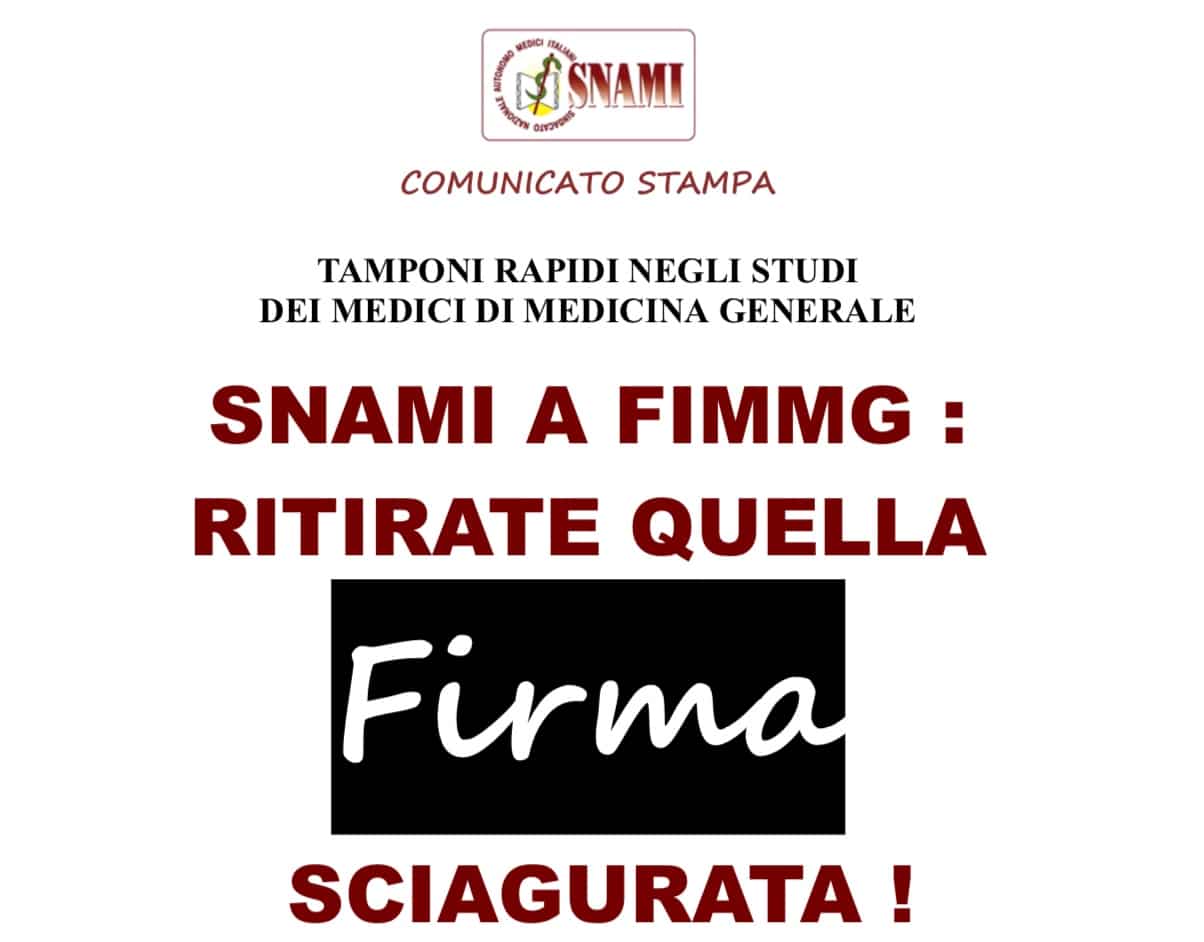 Roma 2 Novembre 2020-La dirigenza del Sindacato Autonomo si rivolge attraverso un duplice appello alla dirigenza della Fimmg e alla base di quel sindacato. <Mai avrei immaginato> dice Angelo Testa, presidente nazionale Snami <di dover fare un appello a Colleghi appartenenti ad un sindacato differente da quello che presiedo. Umilmente, con profondo rispetto nei confronti di chi non la pensa come noi, nel contesto della grave situazione che stiamo vivendo come persone e Medici, invito Silvestro Scotti, segretario nazionale Fimmg, a ripensarci e ritirare la sua firma dall’Acn che di fatto sancisce l’obbligo, pena la decadenza della convenzione per i Medici che non effettueranno i tamponi covid nei loro studi o nelle strutture delle assl, se messe a disposizione.