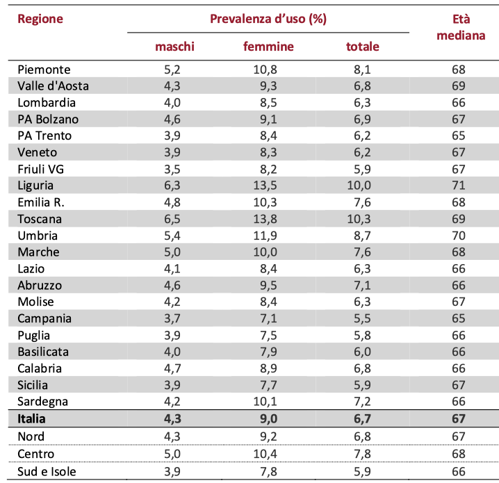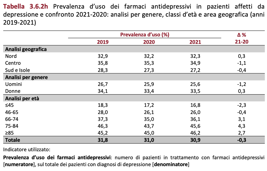 Il rapporto OsMed infatti ci dice a pagina 443 che “circa un paziente su tre con diagnosi di depressione è trattato farmacologicamente (30,9%) nel 2021, con una riduzione dello 0,3% rispetto al 2020. La prevalenza d’uso più elevata si osserva nelle Regioni del Centro (34,9%) rispetto a quelle del Nord (32,3%) e del Sud e Isole (27,2%) e nelle donne rispetto agli uomini (33,5% vs 25,6%). Tale prevalenza mostra inoltre un andamento crescente all’aumentare dell’età, passando difatti dal 36,1% nella fascia di età 66-74 anni al 46,2% dei soggetti più anziani (≥85 anni di età) (Tabella 3.6.2h)”.