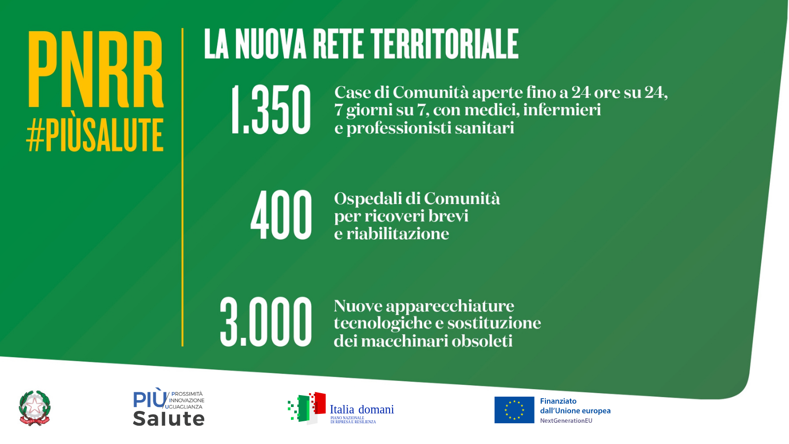 Le Case di Comunità rappresentano un nuovo strumento del Servizio Sanitario Nazionale che andrà collocato in modo appropriato nel sistema delle cure territoriali e che, grazie ai finanziamenti del PNRR (2 miliardi), si svilupperà in 1288 strutture, ampliabili a 1350, una ogni 40/50.000 abitanti.