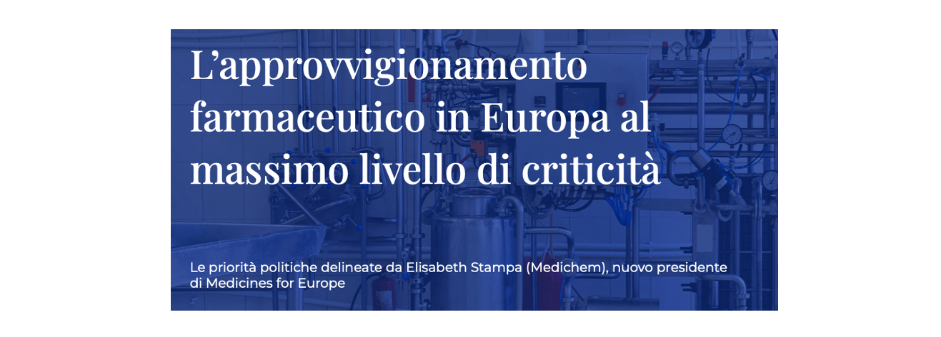 Ad affermarlo è Elisabeth Stampa (CEO di Medichem SA), nuovo presidente di Medicines for Europe, l’associazione che rappresenta le industrie dei medicinali generici, biosimilari e a valore aggiunto in tutta Europa, con oltre 400 stabilimenti di produzione, 126 siti di ricerca e sviluppo e 190mila addetti.