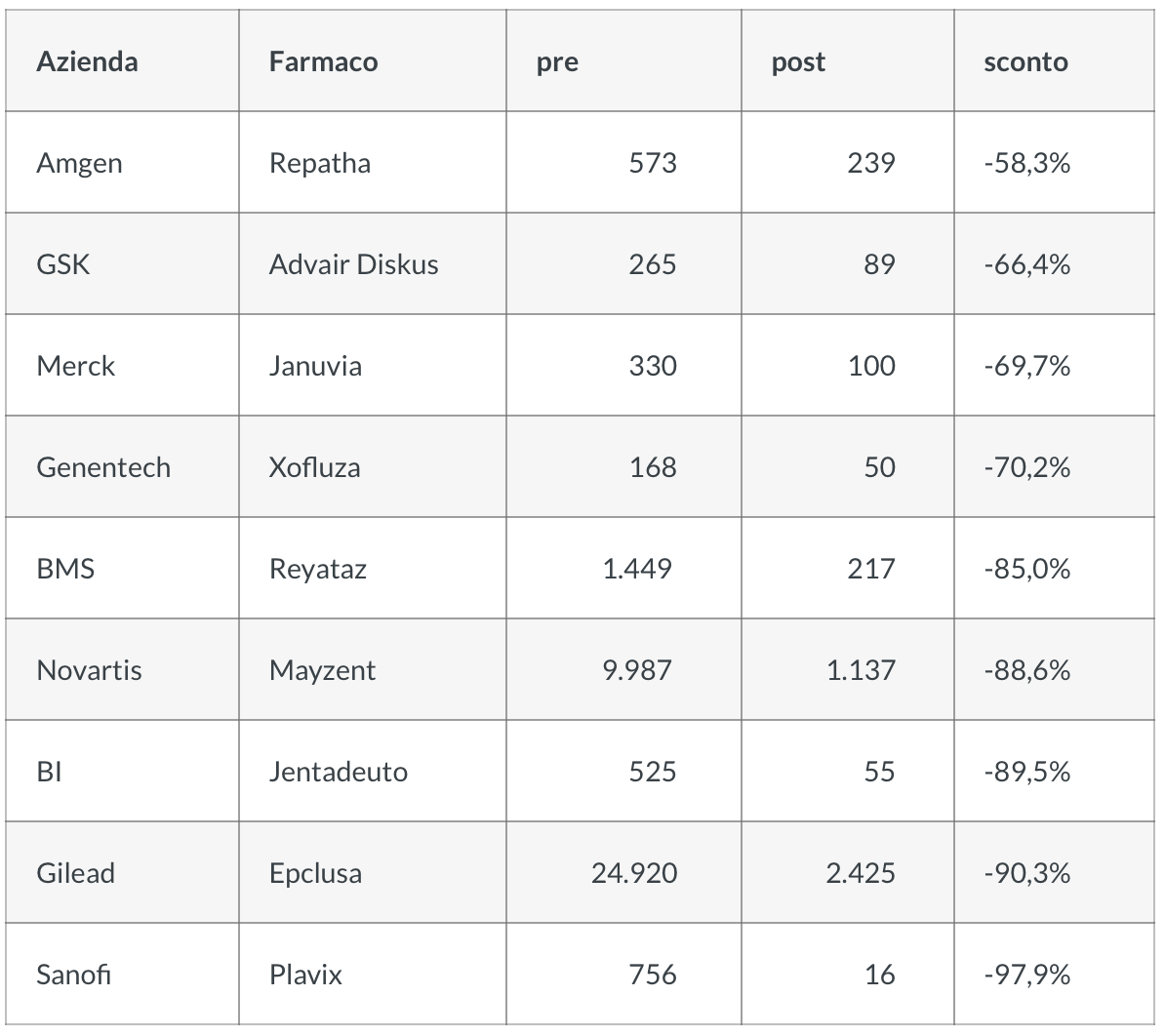 2. Va considerato quali aziende hanno aderito, le più grandi, ma non tutte, e quali farmaci. Gli sconti variano dal 58% di Repatha contro l’ipercolesterolemia di origine familiare al 98% di Plavix, sul mercato da decenni come antiaggregante