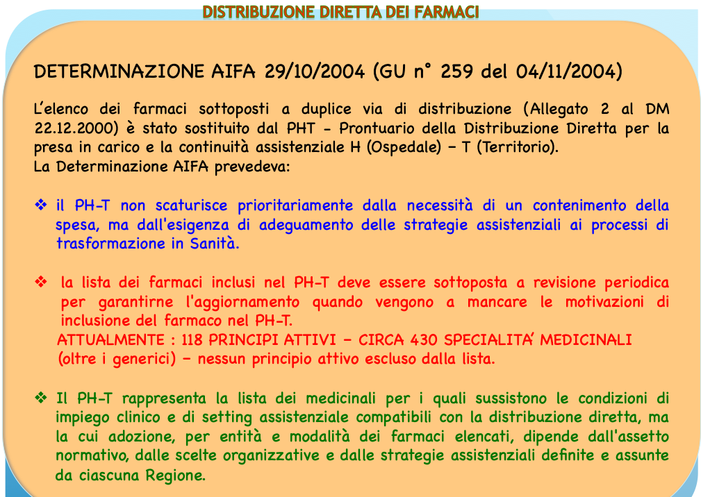 In particolare, le regioni hanno la facoltà di attivare la distribuzione diretta dei farmaci di fascia A e H contenuti nel PHT – Prontuario della distribuzione diretta per la presa in carico e la continuità assistenziale H (Ospedale) – T (Territorio). Il PH-T rappresenta la lista dei medicinali per i quali sussistono le condizioni di impiego clinico e di setting assistenziale compatibili con la distribuzione diretta, ma la cui adozione, per entità e modalità dei farmaci elencati, dipende dall’assetto normativo, dalle scelte organizzative e dalle strategie assistenziali definite e assunte da ciascuna Regione. Dal 2019, lo sconto obbligatorio, il c.d. “prezzo ex-factory”, è stato esteso anche ai farmaci destinati ad essere utilizzati al di fuori delle Strutture Sanitarie