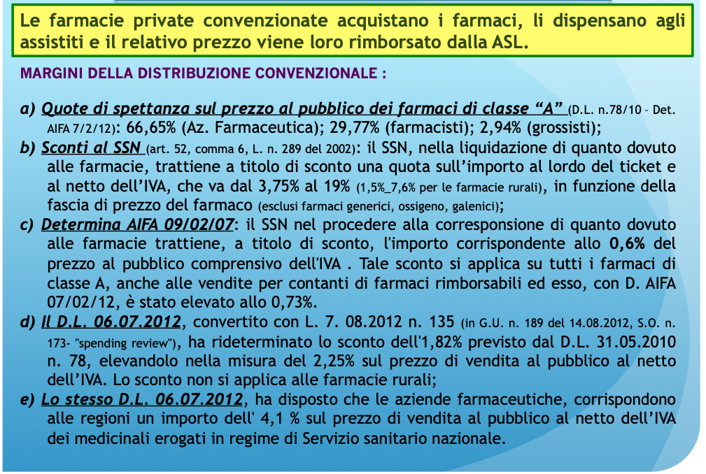 Il Servizio Sanitario Nazionale, nella liquidazione di quanto dovuto alle farmacie, trattiene a titolo di sconto una quota sull’importo al lordo del ticket e al netto dell’IVA che varia a secondo del prezzo del farmaco (dal 3,75% per farmaci fino a € 25,82 al 19% per farmaci con prezzo maggiore di € 154,94).