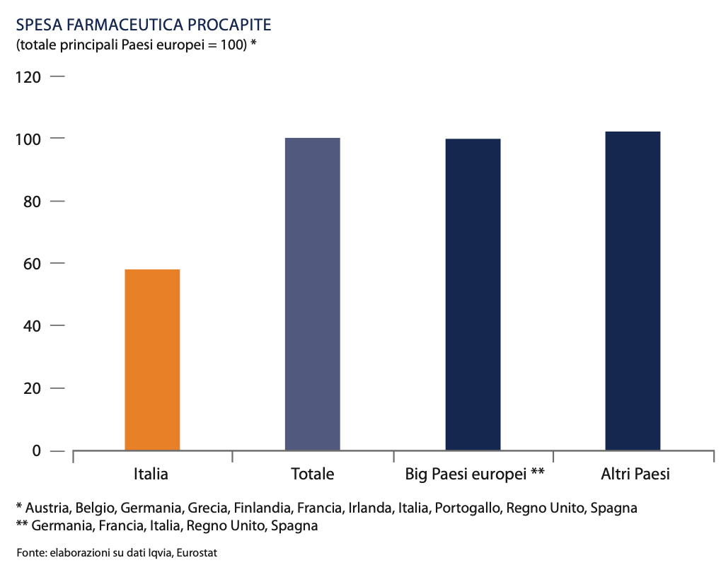 La spesa farmaceutica a carico del SSN si articola nelle due componenti dedicate rispettivamente alla spesa farmaceutica territoriale (convenzionata) e alla spesa farmaceutica ospedaliera. Per il finanziamento della spesa farmaceutica è destinata una quota del finanziamento complessivo ordinario del SSN. In sintesi nel 2021: 32,2 miliardi di euro è la spesa farmaceutica totale (+3,5%), 69,2% è rimborsata dal SSN, aumento del +2,6% della spesa pubblica: DPC (+7,9%) e ospedale (+4,4%), stabile convenzionata (-0,4%) e DD (-1,1%), territorio: maggiori consumi (87%), meno spesa (41%), ospedale: minore consumo (13%), maggiore spesa (59%). La Regione con il valore più alto di spesa lorda pro capite è stata la Campania con 199,9 euro pro capite, mentre il valore più basso si registra nella PA di Bolzano (113,4 euro pro capite), con una differenza tra le due Regioni del 76%. (Fonte OsMed)