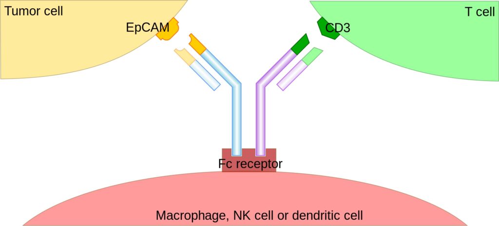 Un anticorpo monoclonale bispecifico o BsMAb o BsAb è una proteina artificiale che è composta di frammenti di due diversi anticorpi monoclonali; questo le permette di legarsi contemporaneamente a due diversi tipi di antigene. Solitamente nell’immunoterapia dei tumori con i normali anticorpi monoclonali non vengono attivati i linfociti T. Un anticorpo monoclonale bispecifico contemporaneamente si lega ad un citotossico cellulare (usando un recettore come il CD3 di un linfocita T) e all’obiettivo terapeutico: le cellule tumorali da distruggere.