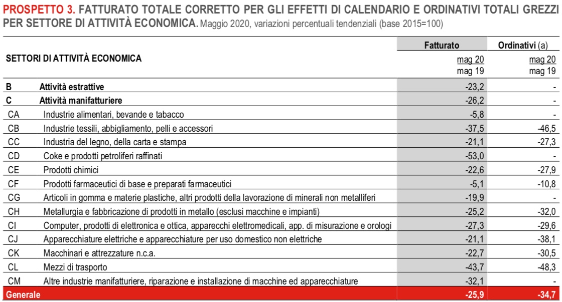 In termini tendenziali e corretto per gli effetti di calendario (i giorni lavorativi sono stati 20 contro i 22 di maggio 2019), il fatturato totale diminuisce del 25,9%, con cali di ampiezza simile nei due mercati (-25,8% il mercato interno e -26,2% quello estero).