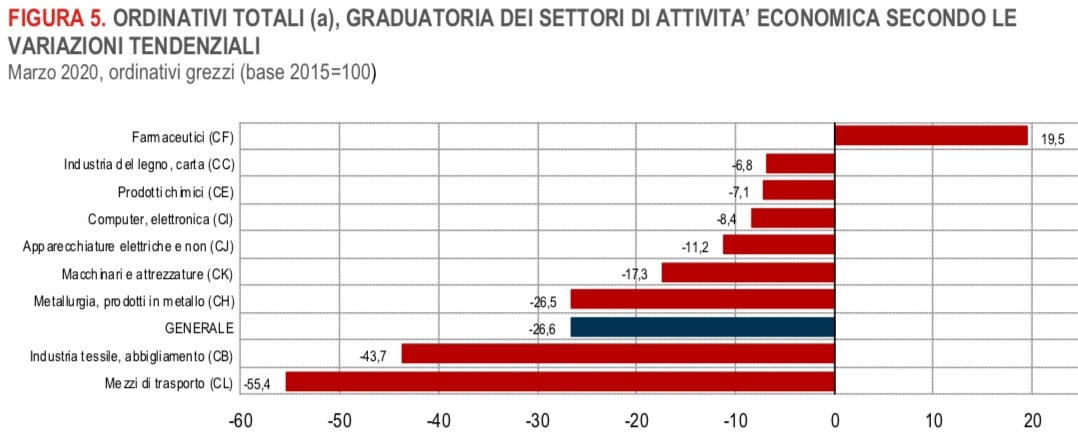 Il calo di fatturato e ordinativi, su base tendenziale, ha raggiunto valori simili a quelli registrati nel momento più acuto della crisi del 2008-2009. Gli unici settori in crescita sono quelli dei beni alimentari e dei prodotti farmaceutici.