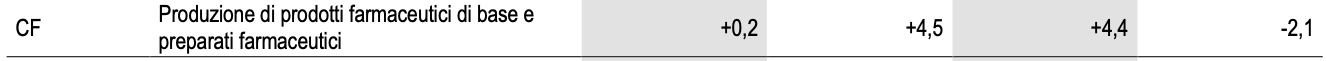I settori di attività economica che registrano gli incrementi tendenziali maggiori sono la produzione di prodotti farmaceutici di base e preparati farmaceutici (+4,4%), le industrie alimentari, bevande e tabacco (+2,1%) e la fabbricazione di computer e prodotti di elettronica (+1,4%). Le flessioni più ampie si registrano nelle industrie tessili, abbigliamento, pelli e accessori (-13,3%), nella fabbricazione di mezzi di trasporto (-9,3%) e nella fabbricazione di coke e prodotti petroliferi raffinati (-8,1%).