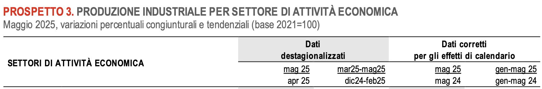 Al netto degli effetti di calendario, a maggio 2025 l’indice generale diminuisce in termini tendenziali dello 0,9% (i giorni lavorativi di calendario sono stati 21 contro i 22 di maggio 2024). Si registrano incrementi tendenziali solo per l’energia (+5,3%); calano, invece, i beni strumentali (-0,2%), i beni di consumo (-1,8%) e i beni intermedi (-2,7%).
