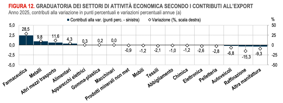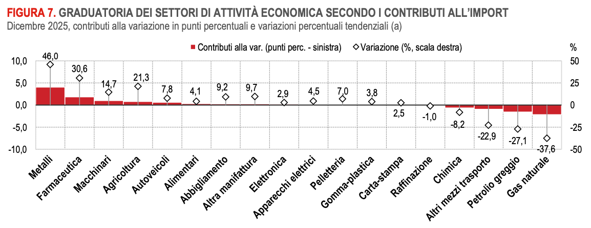 La crescita dell’export in valore nel 2025 coinvolge entrambe le aree, Ue ed extra Ue, e si deve a un numero ristretto di settori tra cui spiccano farmaceutica e metalli e prodotti in metallo. Anche la crescita dell’import riguarda entrambe le aree ed è spiegata soprattutto dall’aumento degli acquisti di prodotti della farmaceutica, dell’agricoltura, metalli e prodotti in metallo, alimentari e macchinari, che più che compensa la contrazione degli acquisti di prodotti energetici (petrolio greggio e raffinazione).