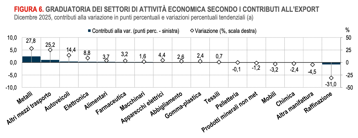 A dicembre 2025 l’export cresce su base sia mensile sia annua, mentre flette nel quarto trimestre 2025, rispetto al precedente.