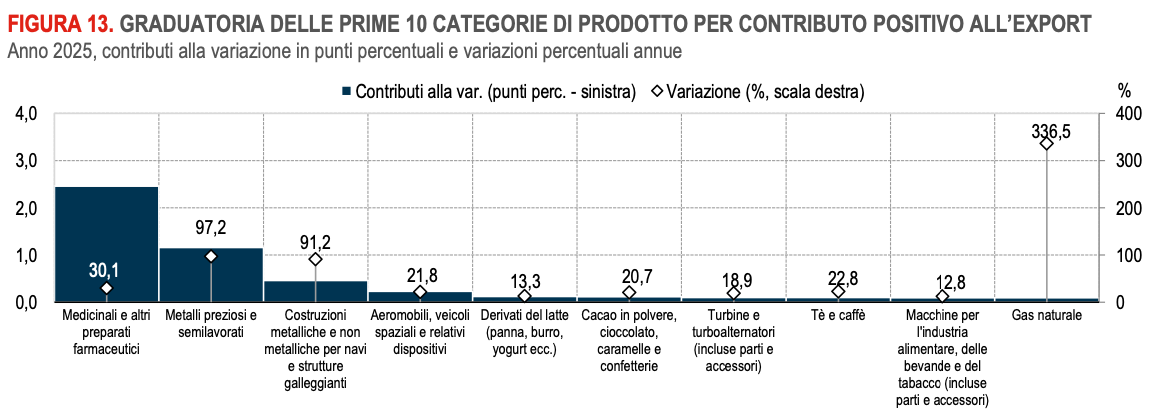 Nel complesso del 2025, rispetto al 2024, l’export in valore cresce del 3,3%: a contribuire sono principalmente le maggiori vendite di articoli farmaceutici, chimico-medicinali e botanici (+28,5%), metalli di base e prodotti in metallo, esclusi macchine e impianti (+9,8%), mezzi di trasporto, esclusi autoveicoli (+11,6%) e prodotti alimentari, bevande e tabacco (+4,3%).