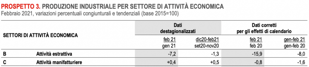 A febbraio 2021 si stima che l’indice destagionalizzato della produzione industriale aumenti dello 0,2% rispetto a gennaio. Nella media del trimestre dicembre-febbraio il livello della produzione cresce dello 0,6% rispetto ai tre mesi precedenti.