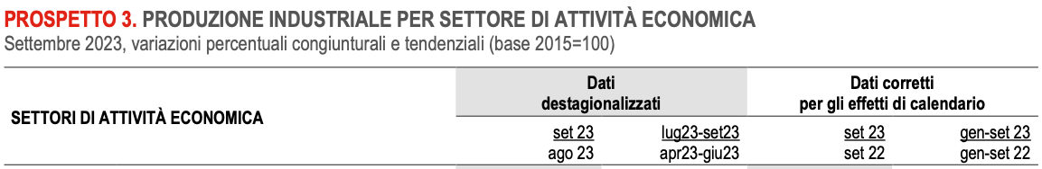 Al netto degli effetti di calendario, a settembre 2023 l’indice complessivo diminuisce in termini tendenziali del 2,0% (i giorni lavorativi di calendario sono stati 21 contro i 22 di settembre 2023). Si registrano incrementi tendenziali solo per i beni strumentali (+2,6%); calano, invece, l’energia (-0,4%), i beni intermedi (-2,6%) e in misura più marcata i beni di consumo (-6,5%).