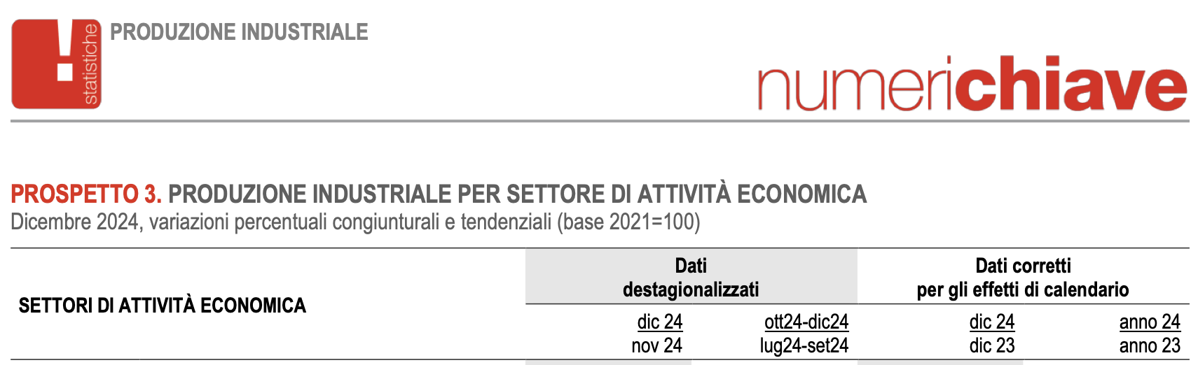 A dicembre 2024 si stima che l’indice destagionalizzato della produzione industriale diminuisca del 3,1% rispetto a novembre. Nella media del quarto trimestre il livello della produzione si riduce dell’1,2% rispetto ai tre mesi precedenti.