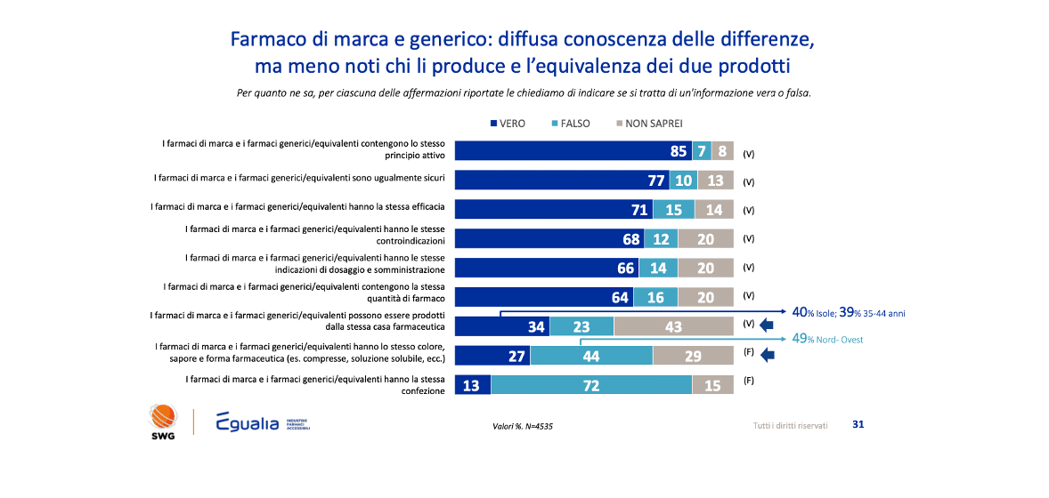 E’ denso di luci e ombre il rapporto degli italiani con i farmaci generici. In particolare per quanto riguarda il livello informazione, non sufficientemente accurato. Fondamentale il ruolo di farmacisti e medici, alle cui indicazioni si affidano due intervistati su tre. È quanto emerge da un’indagine presentata al convegno Egualia, condotta nel mese di giugno da SWG, su un campione di 4.534 maggiorenni residenti in Italia. I risultati della ricerca – che ha esplorato il rapporto degli italiani con la salute al tempo della pandemia – sono stati presentati nel corso di un convegno a Roma, assieme al report “Cittadini e cura delle cronicità” di Cittadinanzattiva.