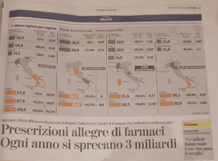 Il sole, si sa, fa bene alle ossa. Ma chissà perché nelle assolate Puglia e Sardegna si consuma il doppio dei farmaci per la cura dell’osteoporosi rispetto alle fredde Piemonte e Valle d’Aosta. Si sa anche che gli italiani sono un po’ troppo facili divoratori di antinfiammatori, al punto da dover poi consumare altre medicine per curare i danni provocati allo stomaco. Ma che si prescrivano in modo allegro lo dimostra ora il dato di Puglia e Calabria, dove si mandano giù il triplo delle pillole“.