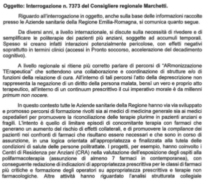 N.d.R.: Sopra il questionario. C’è da chiedersi a cosa serva la deprescrizione se c’è l’appropriatezza. Ogni altro commento è superfluo, basta leggere il questionario. L’Assessore cerca comunque di “aggiusta il tiro” di un questionario per lo meno ambiguo.