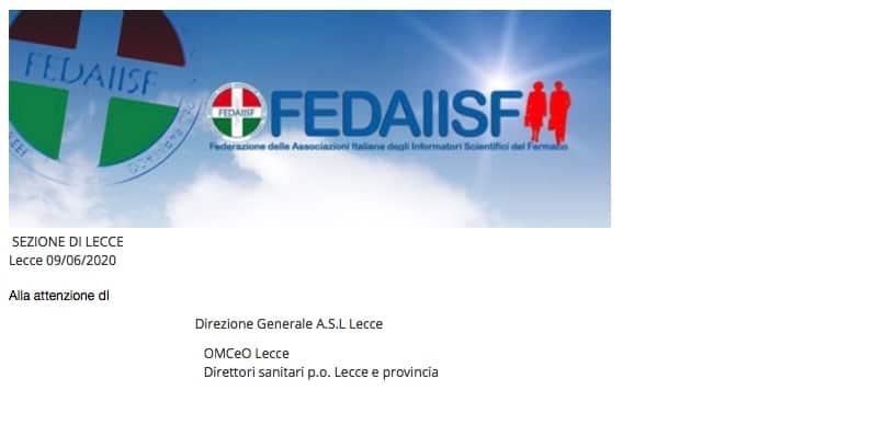 FEDAIISF, consapevole del momento di difficoltà che sta vivendo il sistema sanitario, chiede al fine di una ripresa dell’attività di informazione scientifica una fattiva collaborazione da parte della classe medica, in modo da avviarla in maniera ordinata, coordinata e condivisa con tutte le organizzazioni di categoria e che permetta un accesso nelle strutture pubbliche e convenzionate col SSN ( OSP..Cliniche etc..), già resa possibile dalla Delibera della Regione Puglia del 09/05/2020 e secondo le disposizioni dei vari direttori delle U.O.