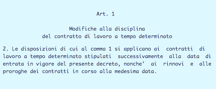 Il Decreto Dignità fra l’altro dice all’art. 1 comma 2 “Le disposizioni di cui al comma 1 si applicano ai contratti di lavoro a tempo determinato stipulati successivamente alla data di entrata in vigore del presente decreto, nonché ai rinnovi e alle proroghe contrattuali successivi al 31 ottobre 2018”. Ne deriva che il Decreto non colpisce i contratti a termine già in essere che possono essere rinnovati fino a 36 mesi, come prima e, nel caso della Collega, potrebbe essere rinnovato anche il 2 settembre, data di scadenza del suo contratto temporaneo. Comunque la si pensi, ne deriva anche che se il contratto di lavoro temporaneo della Collega non dovesse essere rinnovato si avrebbe la conferma che non centra con il Decreto Dignità.