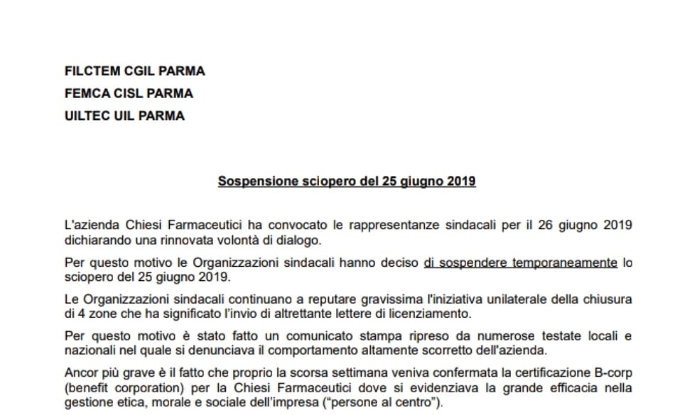 Licenziamenti Chiesi. L’azienda apre ad un incontro per il 26 giugno. Sciopero sospeso Redazione Fedaiisf 20 Giugno 2019