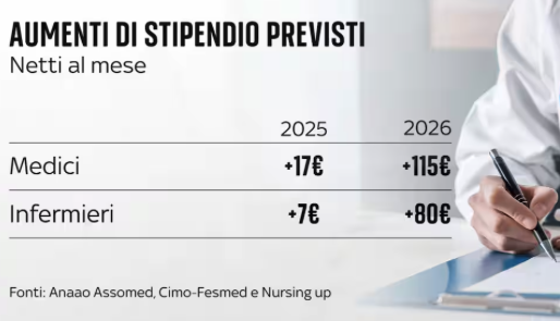 La manovra prevede un aumento dell’indennità di specificità medica sanitaria di 17 euro nette per i medici e 14 euro netti per i dirigenti sanitari per il 2025, 115 euro nel 2026 per i medici e zero per i dirigenti sanitari, mentre nelle tasche degli infermieri arriverebbero per il 2025 circa 7 euro e per il 2026 circa 80 euro, e non va meglio per le altre professioni sanitarie ex legge 43/2006. Peraltro si parla di risorse legate, per la maggior parte, a un contratto la cui discussione inizierà solo tra almeno due anni, e che arriveranno nelle tasche degli interessati chissà quando.