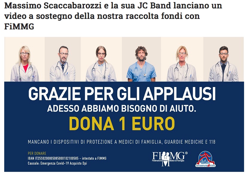 «Oltre alla sua capacità di farci sognare, la musica è da sempre uno dei mezzi più potenti per unire le persone al di là delle loro diverse opinioni. L’iniziativa della JC Band* sarà, ne siamo convinti, di enorme aiuto alla nostra campagna a tutela della salute dei medici di medicina generale e dei cittadini italiani» – dichiara Silvestro Scotti, segretario generale Fimmg. «Voglio ringraziare Massimo Scaccabarozzi, che ha scelto di tenderci una mano e aiutarci in questa raccolta fondi, con una modalità caratteristica delle sue “corde” vocali e di “rete” di solidarietà. Alle sue iniziative abbiamo sempre partecipato come sostenitori e, trovandoci oggi nel ruolo di sostenuti, non possiamo che apprezzarne ancor di più la sensibilità».